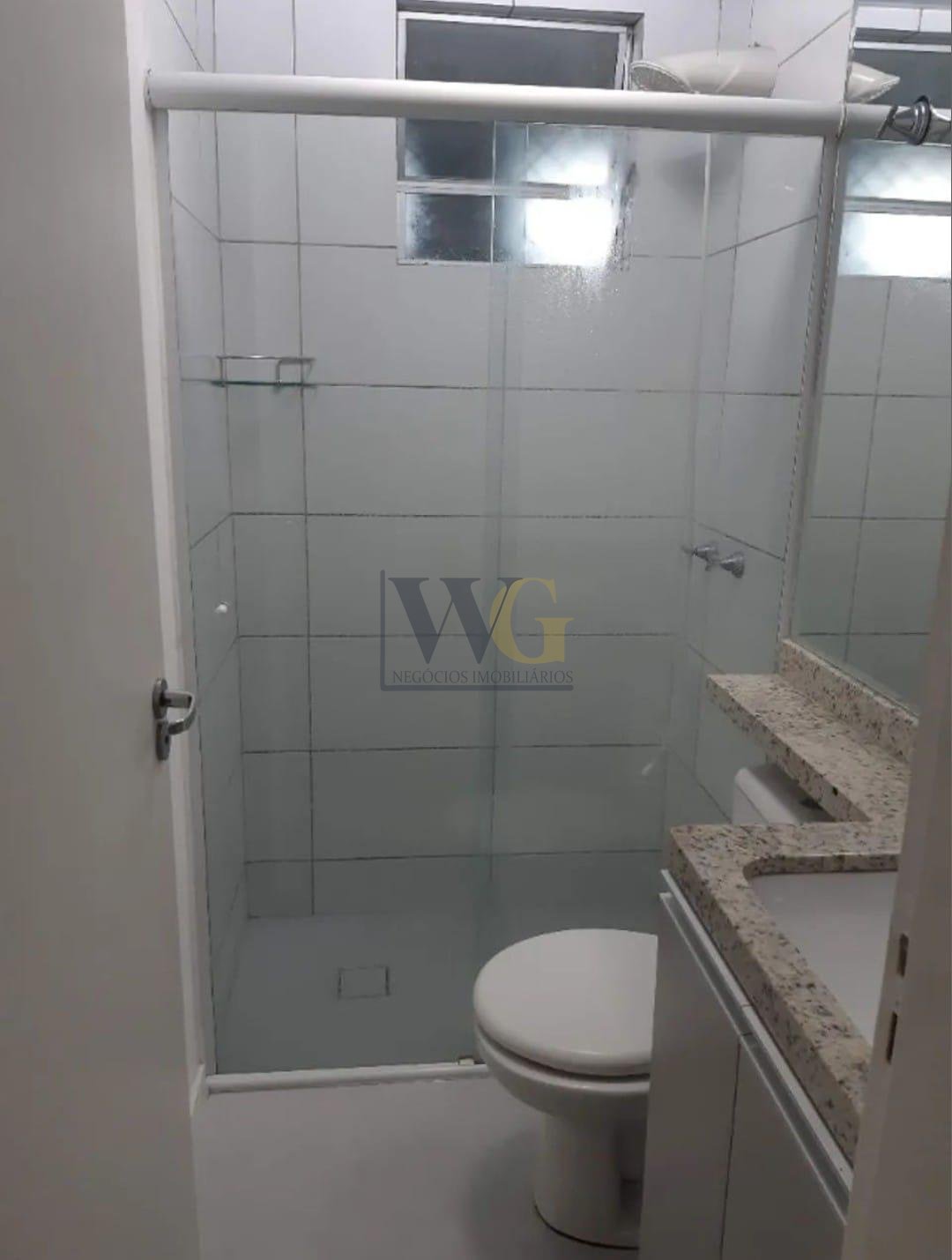 Banheiro completo com bancada em granito, armário planejado, box e espelho grande;