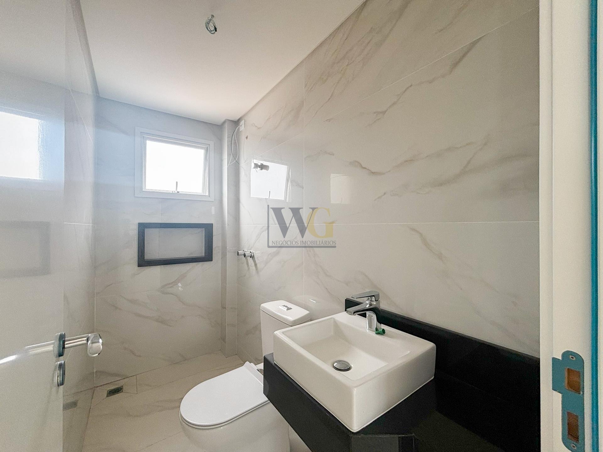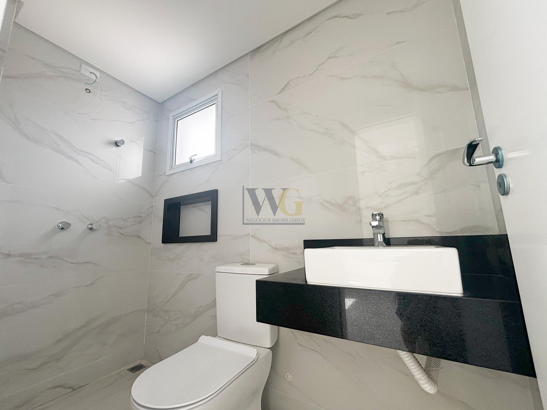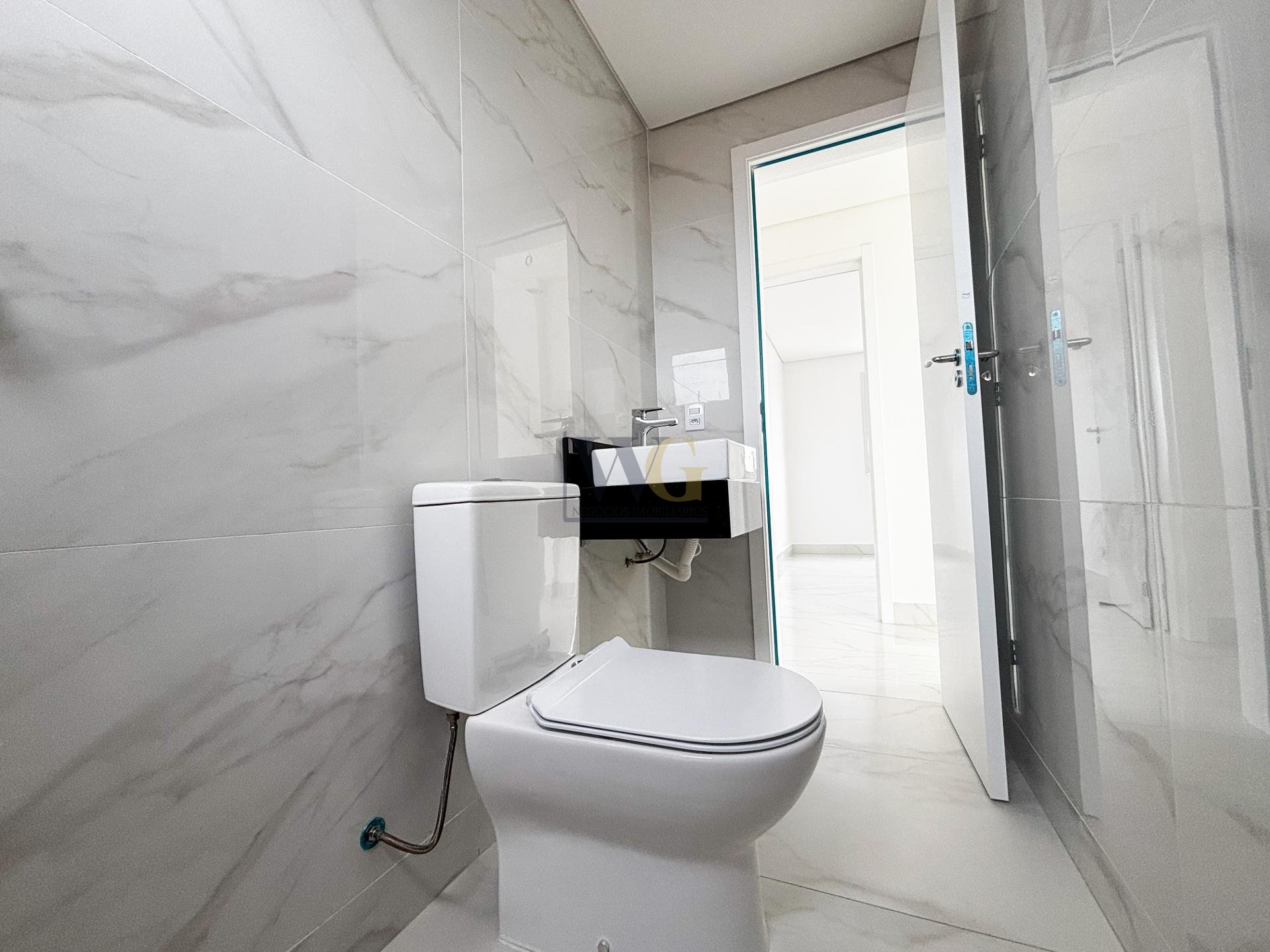 Banheiro social com revestimentos modernos, pia e vaso já instalados, de alta qualidade