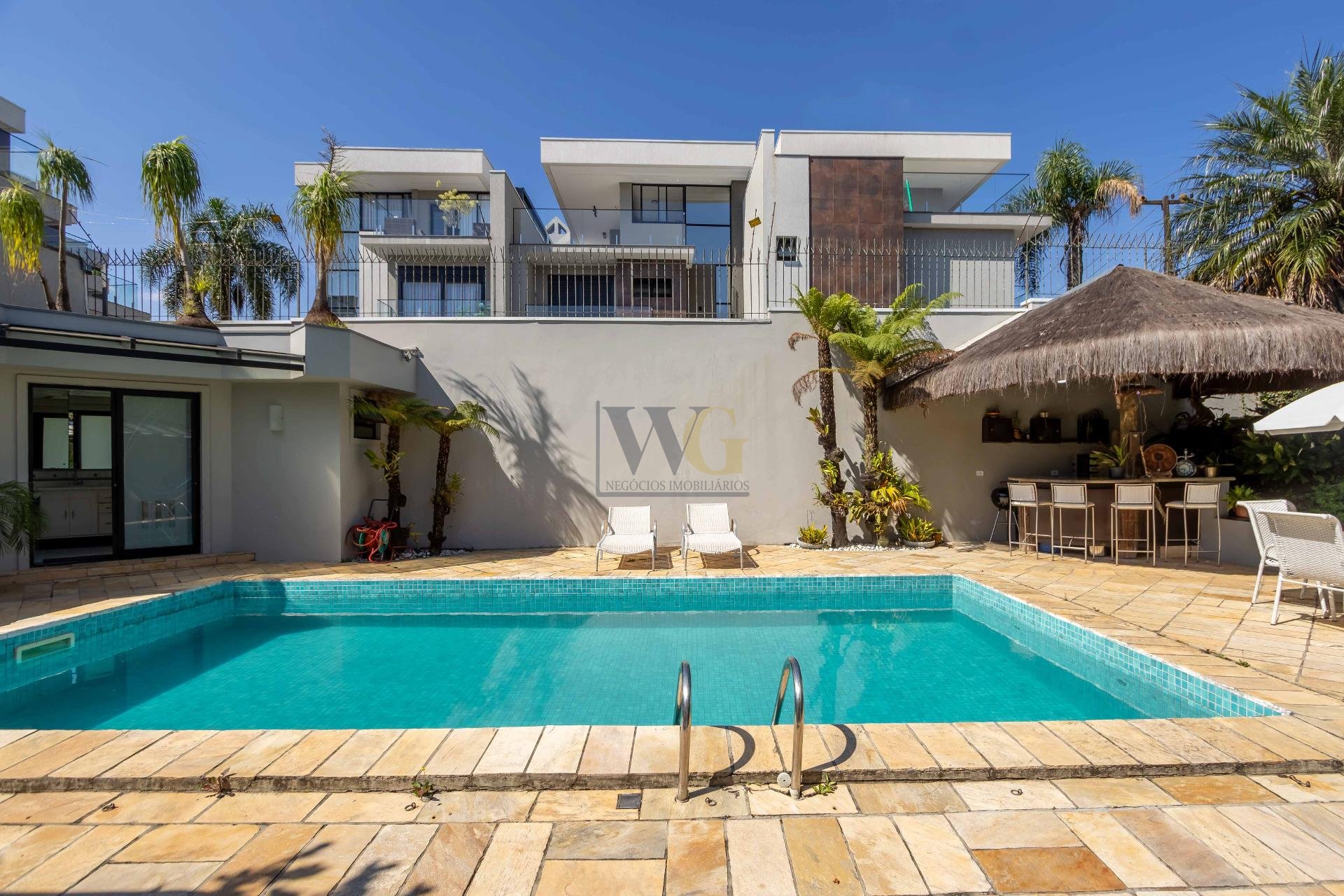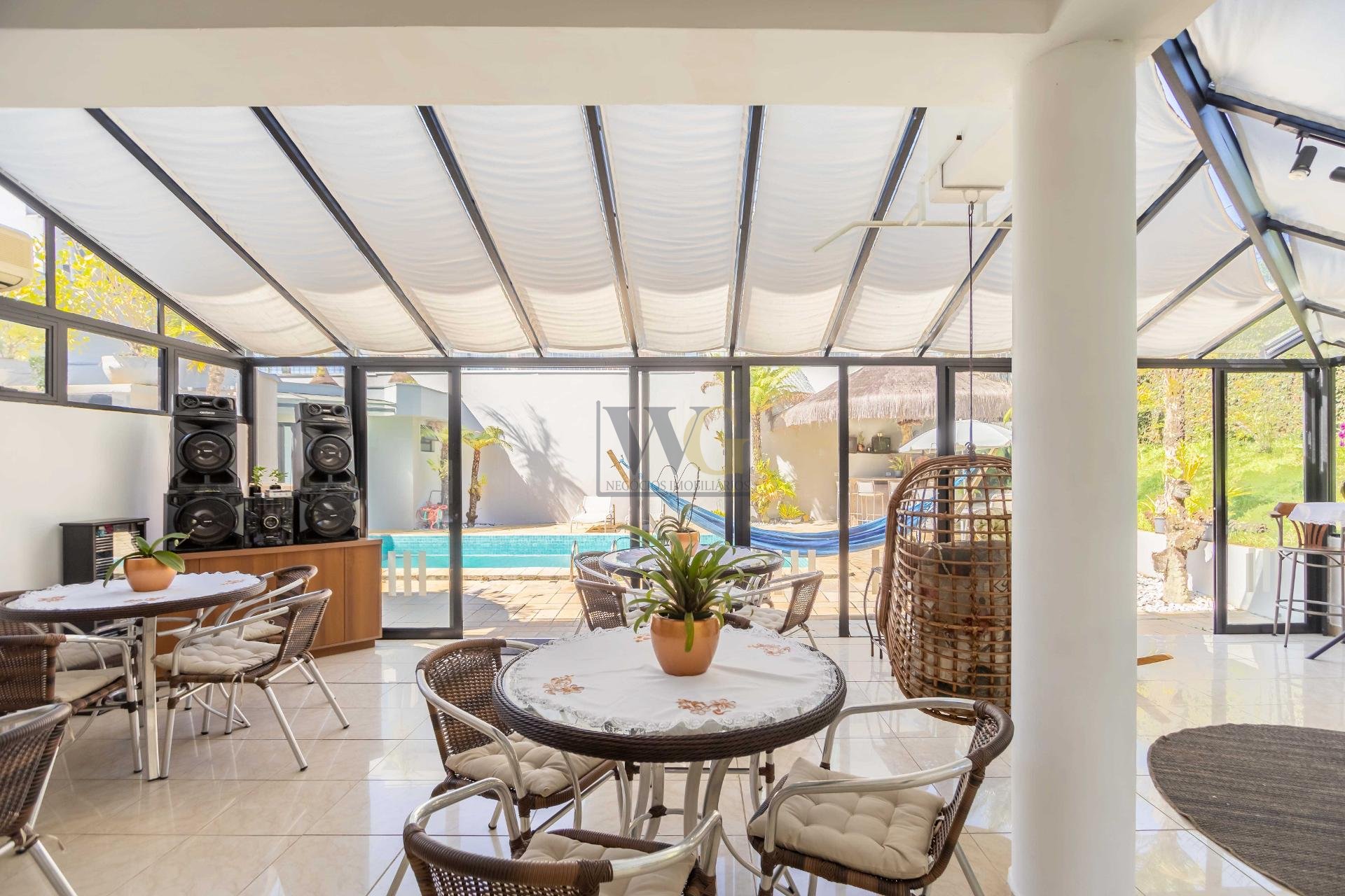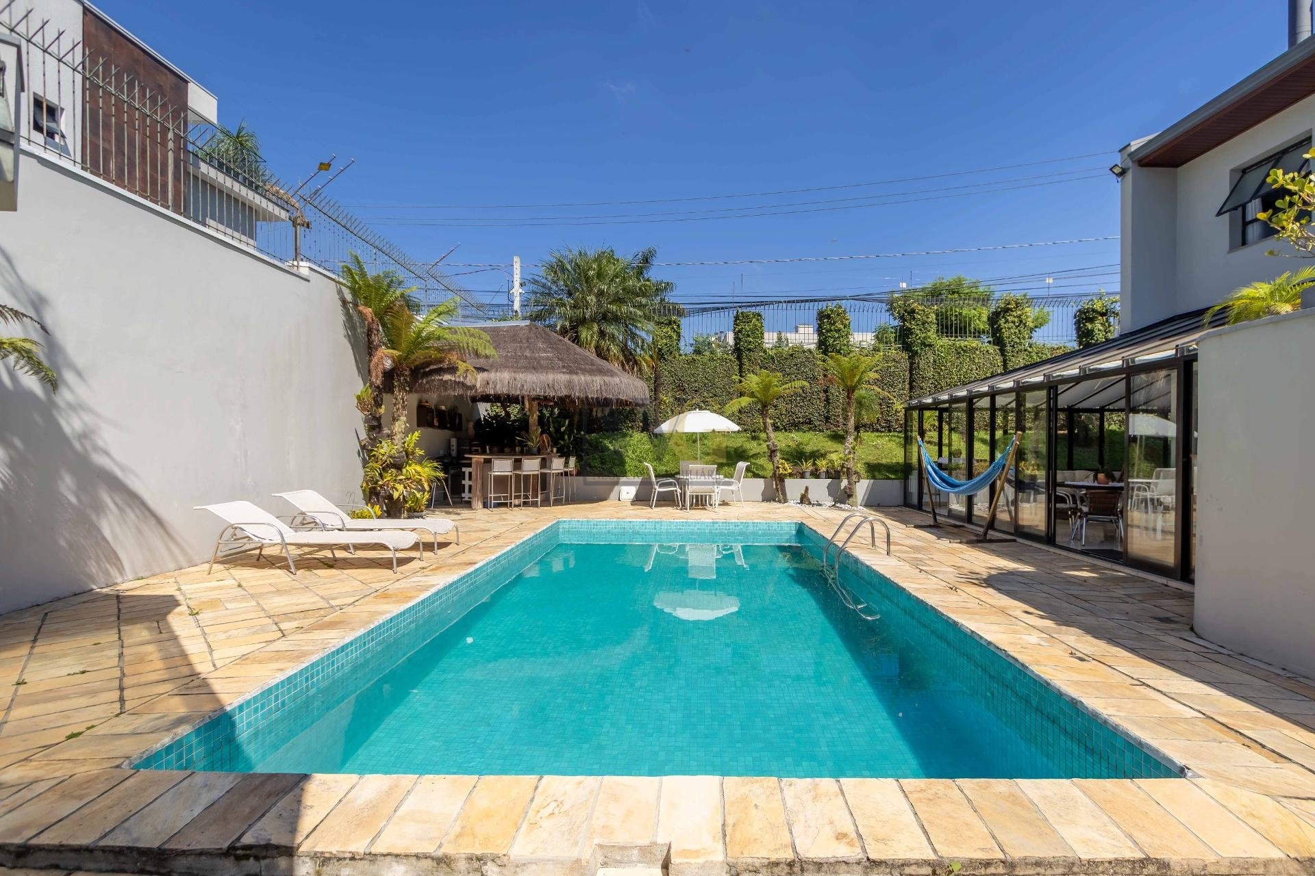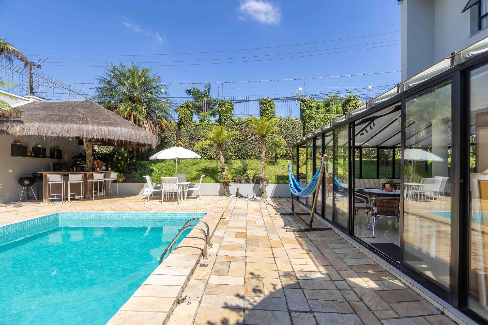 A residência conta ainda com 5 banheiros, 4 vagas de garagem, vestiário completo com chuveiro para atender com praticidade momentos de lazer e piscina, além de acabamentos de altíssimo padrão  incluindo pisos de porcelanato premium, esquadrias amplas e infraestrutura pronta para climatização e automação residencial.