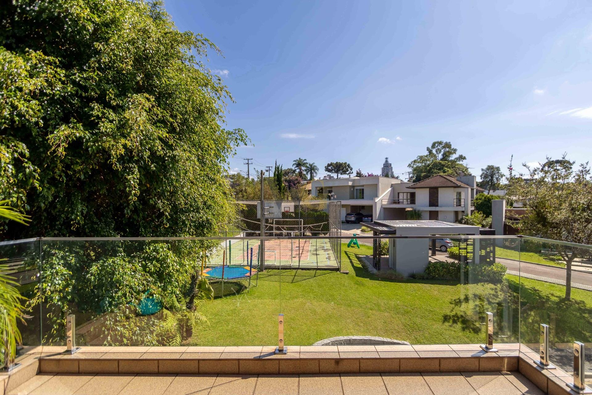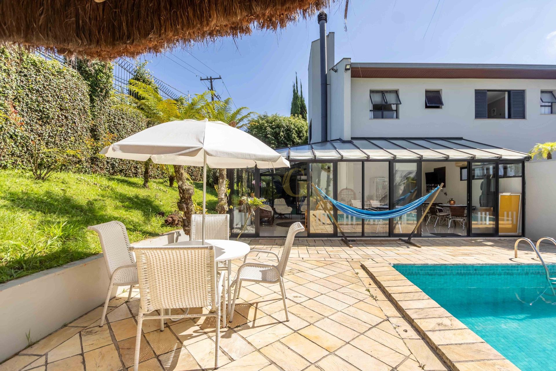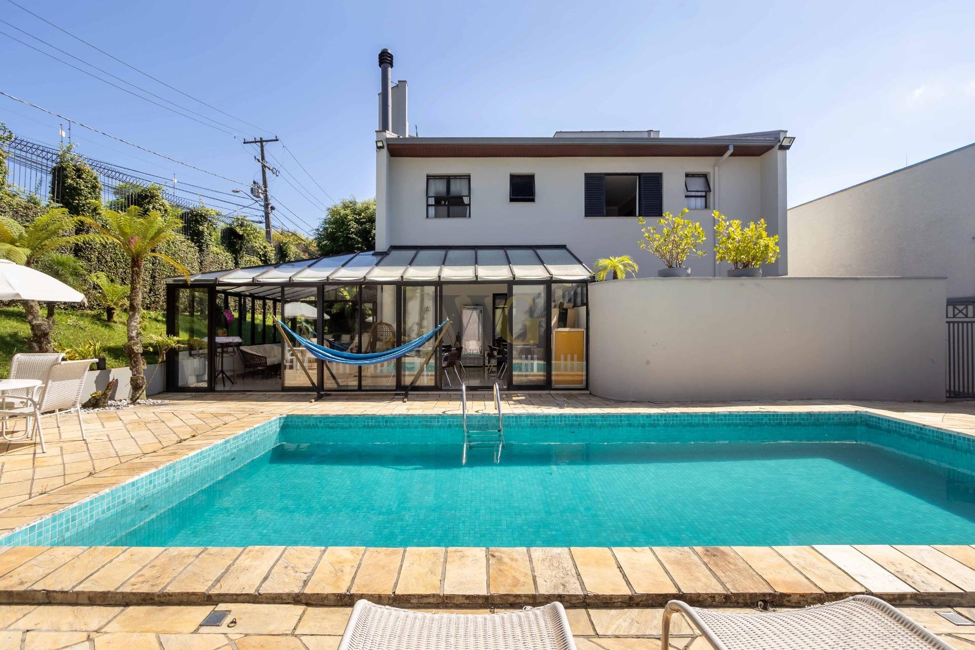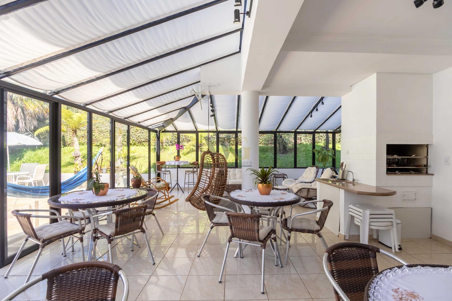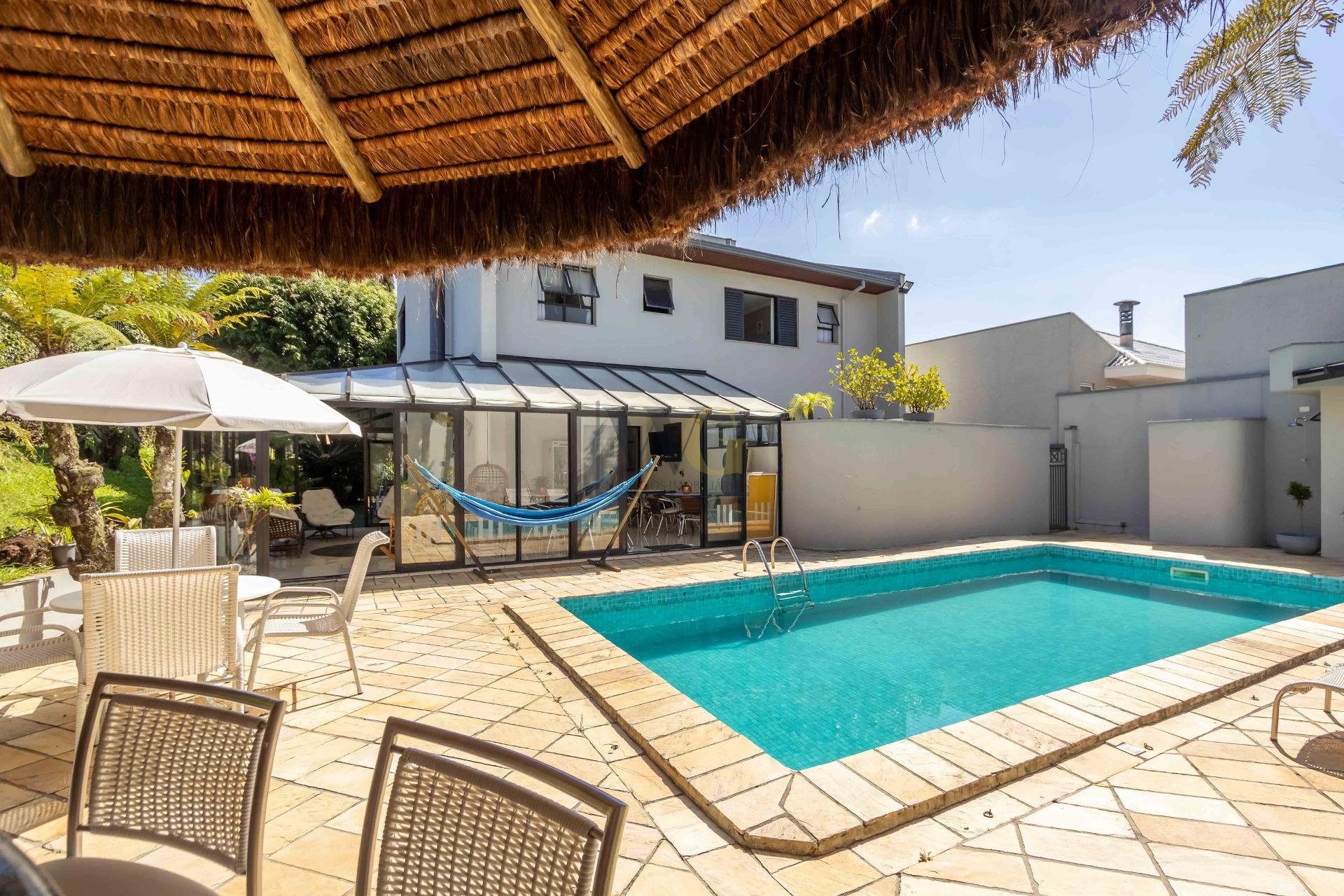 A residência conta ainda com 5 banheiros, 4 vagas de garagem, vestiário completo com chuveiro para atender com praticidade momentos de lazer e piscina, além de acabamentos de altíssimo padrão  incluindo pisos de porcelanato premium, esquadrias amplas e infraestrutura pronta para climatização e automação residencial.