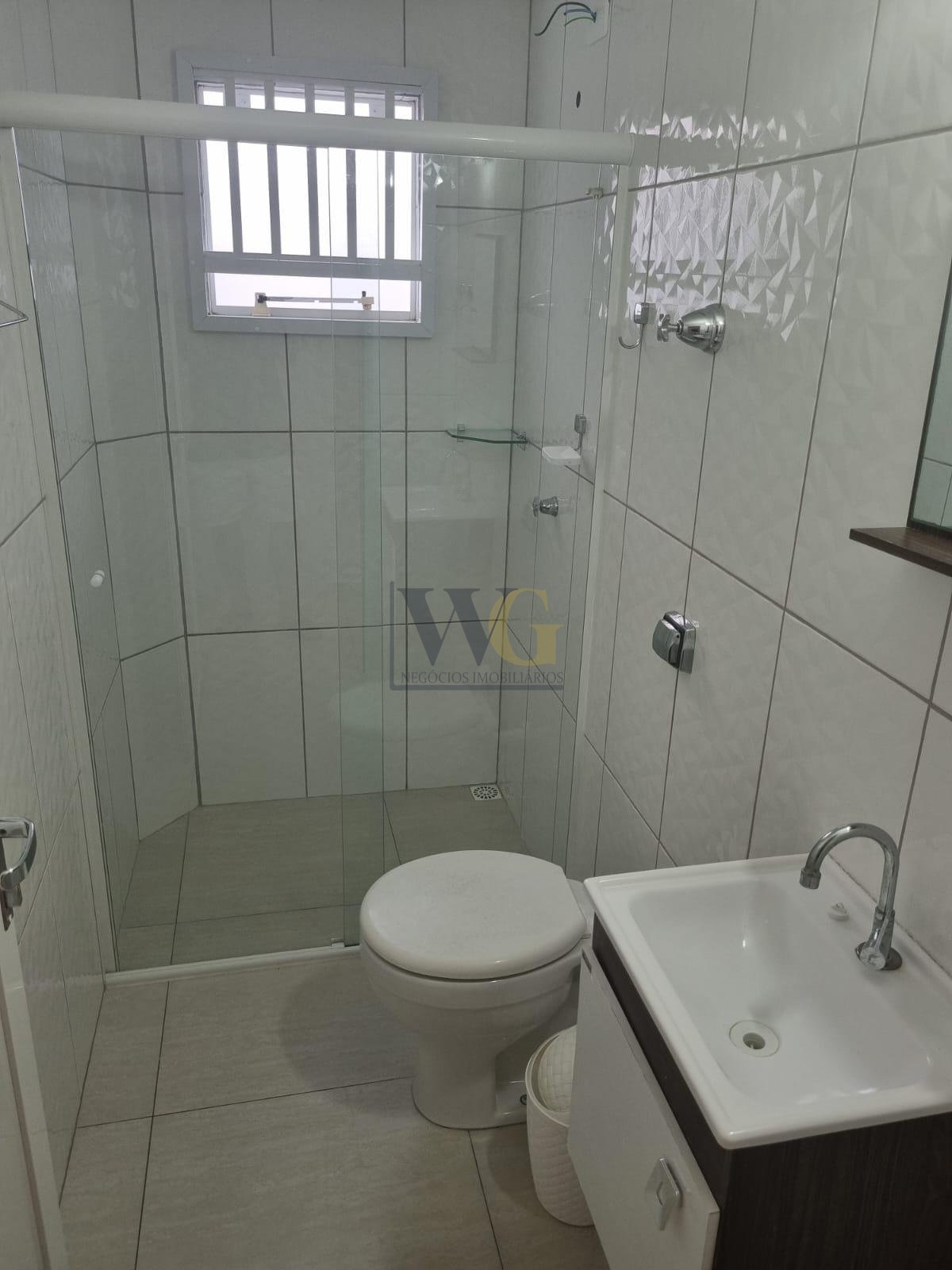 - Banheiros modernos com revestimento 3D e box em vidro;