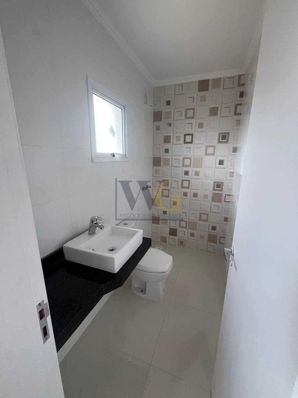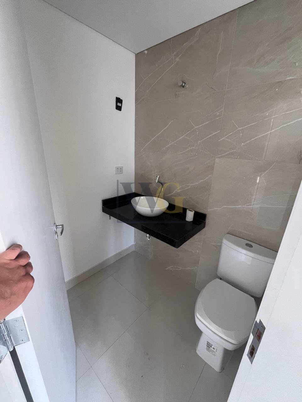 Lavabo no piso inferior e banheiro social no superior